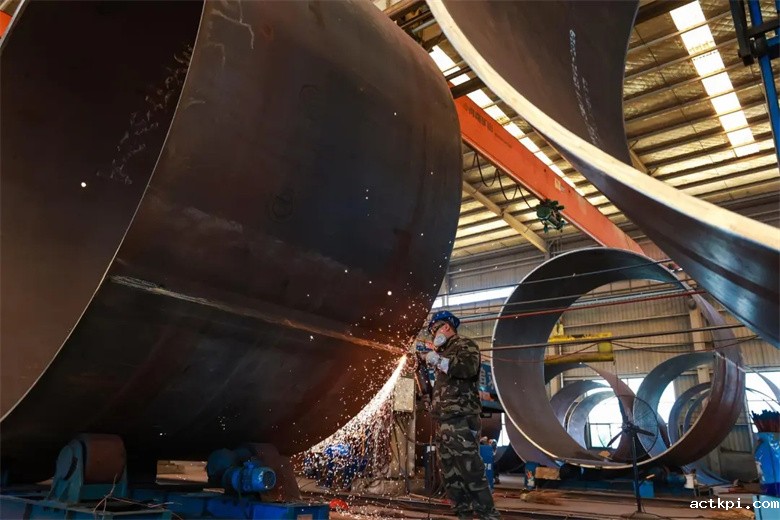 与此同时,甘肃创腾电力装备有限公司厂房内,弧光闪烁、焊花四溅。一块块经过严格检验的优质钢材被大型龙门吊送入生产线,经过精密的多头数控切割机切割后,送入大型卷板机,在巨大的压力下被缓缓卷制成完美的圆筒状。