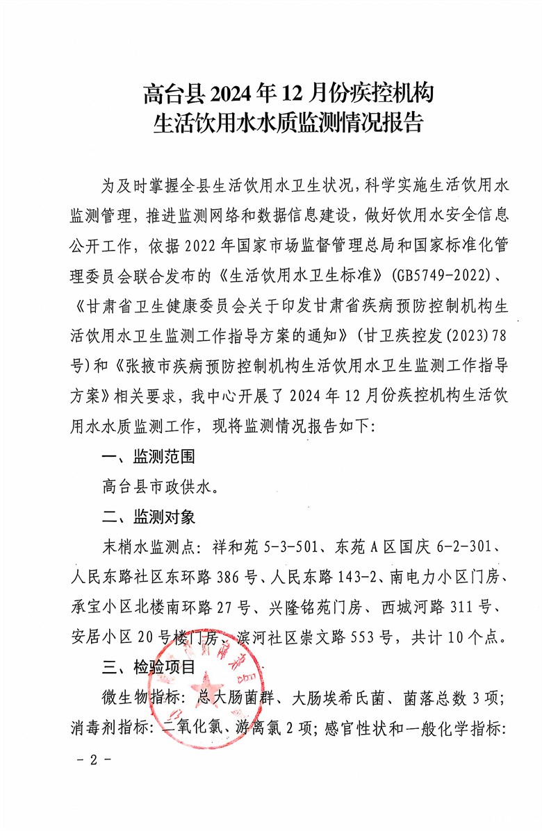 关于报送taptap点点2024年12月份疾控机构生活饮用水水质监测情况报告的报告