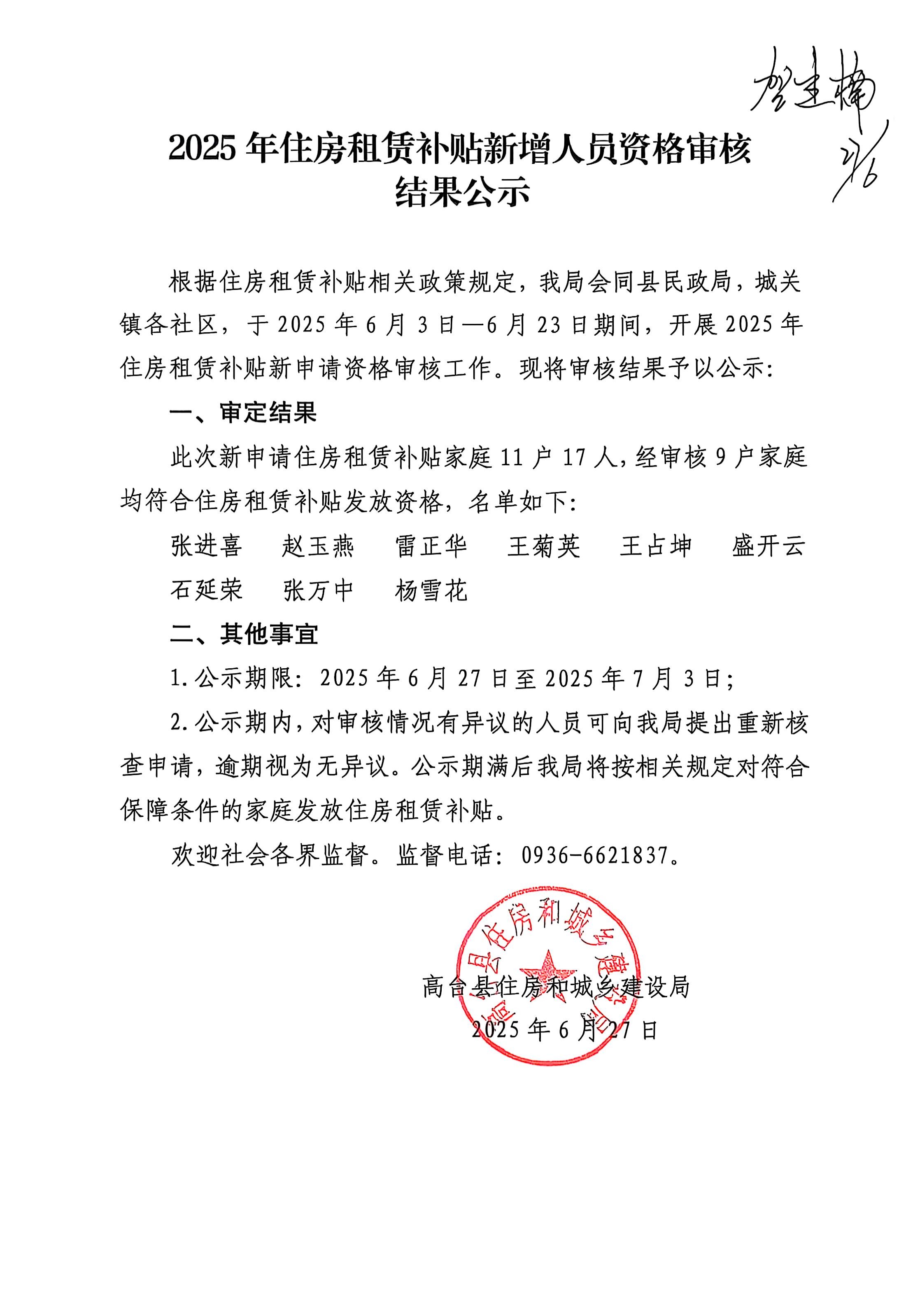 2025年住房租赁补贴新增人员资格审核结果公示