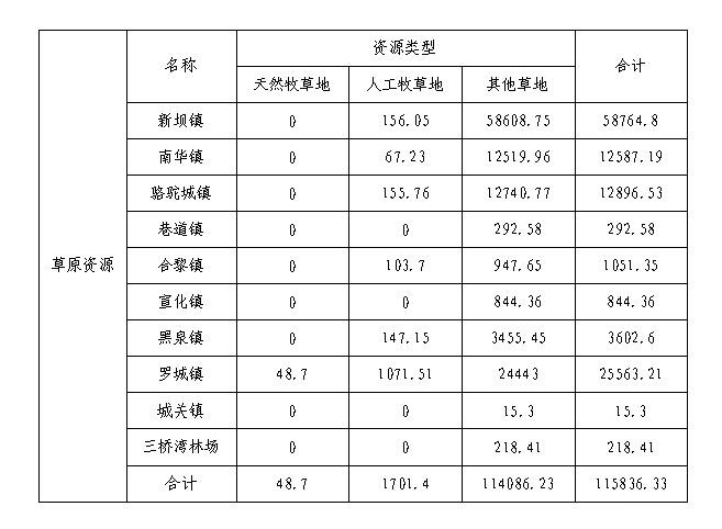 依据自然资源部办公厅印发的《自然资源确权登记操作指南(试行)》中草原资源分类方法,根据我县第三次全国国土调查初始成果数据,taptap点点草原面积115836.33公顷,其中天然牧草地48.7公顷;人工牧草地1701.4公顷;其他草地114086.23公顷,各镇均有分布,详见表8。