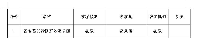 全县有沙漠公园1处,级别为国家级,分布于黑泉镇,详见表2。