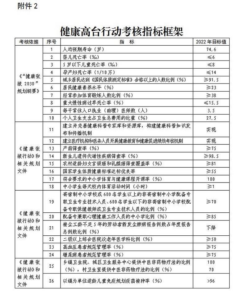 (二)考核内容。围绕健康高台建设主要目标任务要求,同时兼顾数据的可获得性,建立相对稳定的考核指标框架(见附件2)。
