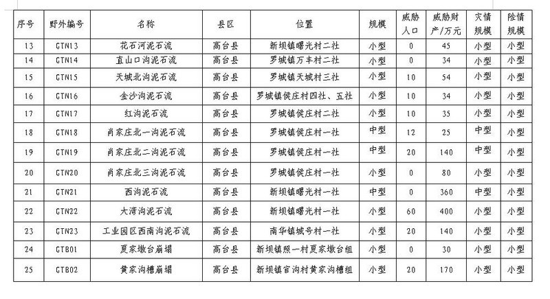 我县地处甘肃省河西走廊中部,黑河中游干流下段,北部合黎山属阿拉善地块,基岩裸露,褶皱和断裂较发育,南部处于榆木山、祁连山北麓,受地形地貌、地质构造、岩土体工程地质性质、植被、人口分布情况、人类工程活动等因素的影响和制约,造成本县区域泥石流等地质灾害较为发育。结合新一轮taptap点点地质灾害1:5万详细调查结果,我县分布有地质灾害隐患点25处,其中:新坝镇14处(泥石流12处,崩塌2处),合黎镇3处(泥石流),南华镇1处(泥石流),罗城镇7处(泥石流)。按照危害规模划分,大型2处;中型11处;小型12处。威胁人口3137人,威胁财产16090万元。(详见附件)