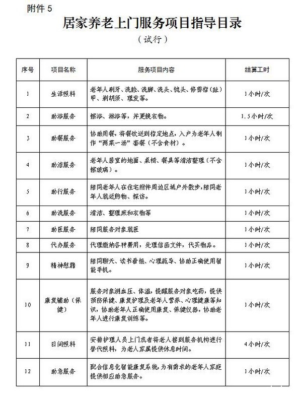 2.规范居家养老上门服务内容。承接服务的企业或社会组织要根据老年人能力评估情况及个体需求,参考《居家养老上门服务项目指导目录(试行)》(附件5),与老年人及监护人签订服务协议,对服务对象及其照护者进行适老化产品使用培训和基本护理知识及能力培训,并根据协议约定为签约老年人提供包括并不限于生活照料、康复辅助(保健)精神慰藉、日间照料以及助餐、助洁、助行、助浴、助医、康复、巡访关爱等居家养老上门服务。重度失能老年人每月可享受不少于6小时的服务时长,中度和轻度失能老年人每月可享受不少于4小时的服务时长,按服务时长给予一定服务补贴。承接主体要根据服务对象身体状况和照护需求,经与服务对象或其监护人商议,及时调整服务计划。服务企业或社会组织可根据老年人家庭照护需求,在补贴服务范围基础上,建立老人及家庭自费服务项目清单,采取“一户一策”方式定制个性化服务内容,并结合实际提供相应时长的居家养老上门服务。