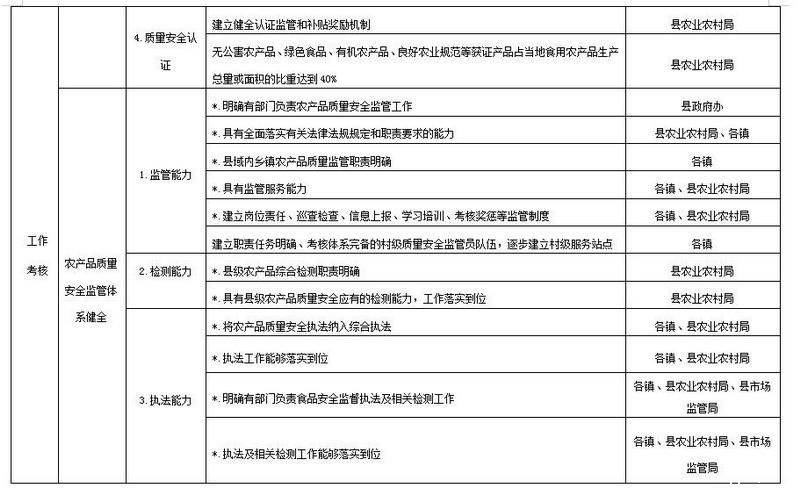 (一)全面落实属地管理责任。县人民政府对全县农产品质量安全负总责,将农产品质量安全工作纳入政府重要议事日程,统筹省级农产品质量安全县创建工作。健全农产品质量安全监管体系、考核体系和责任追究制度,将农产品质量安全工作纳入各镇及相关部门绩效考核重要内容。建立健全地方财政投入保障机制,将监管经费纳入本级财政预算,年度增长幅度满足监管工作的实际需要,保障监管工作持续有效开展。各镇人民政府对本辖区农产品质量安全负总责,根据县上统一安排做好省级农产品质量安全县创建各项工作。